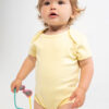 Dit baby rompertje is beschikbaar in verschillende kleuren en geschikt voor alle baby’s, van pasgeboren tot aan 18 maanden oud. Het is gemaakt van 100% katoen met een gewicht van 160 g/m². Het rompertje heeft geen label om het comfort voor de baby te verbeteren en om personalisering te vergemakkelijken. Wel is er een klein labeltje voor de maatvoering. De kruissluiting is gemakkelijk te verwisselen.
